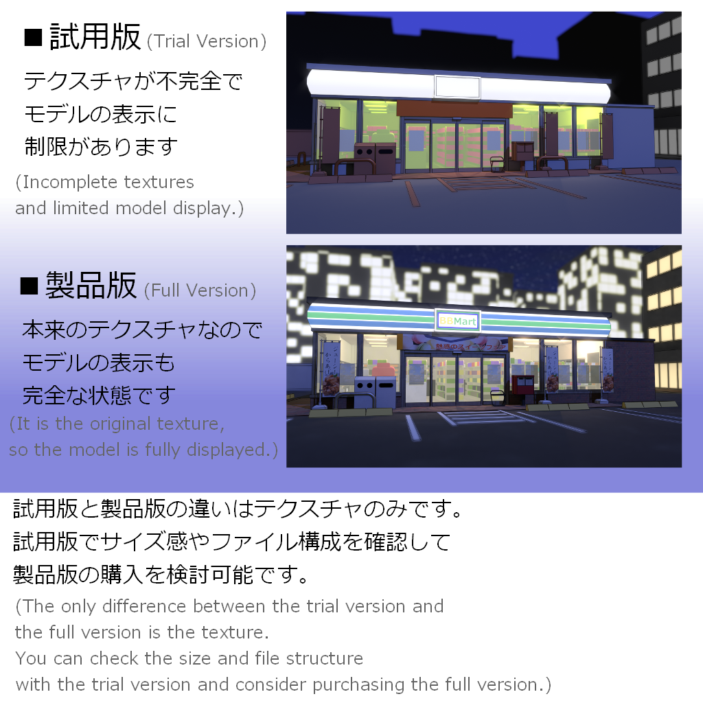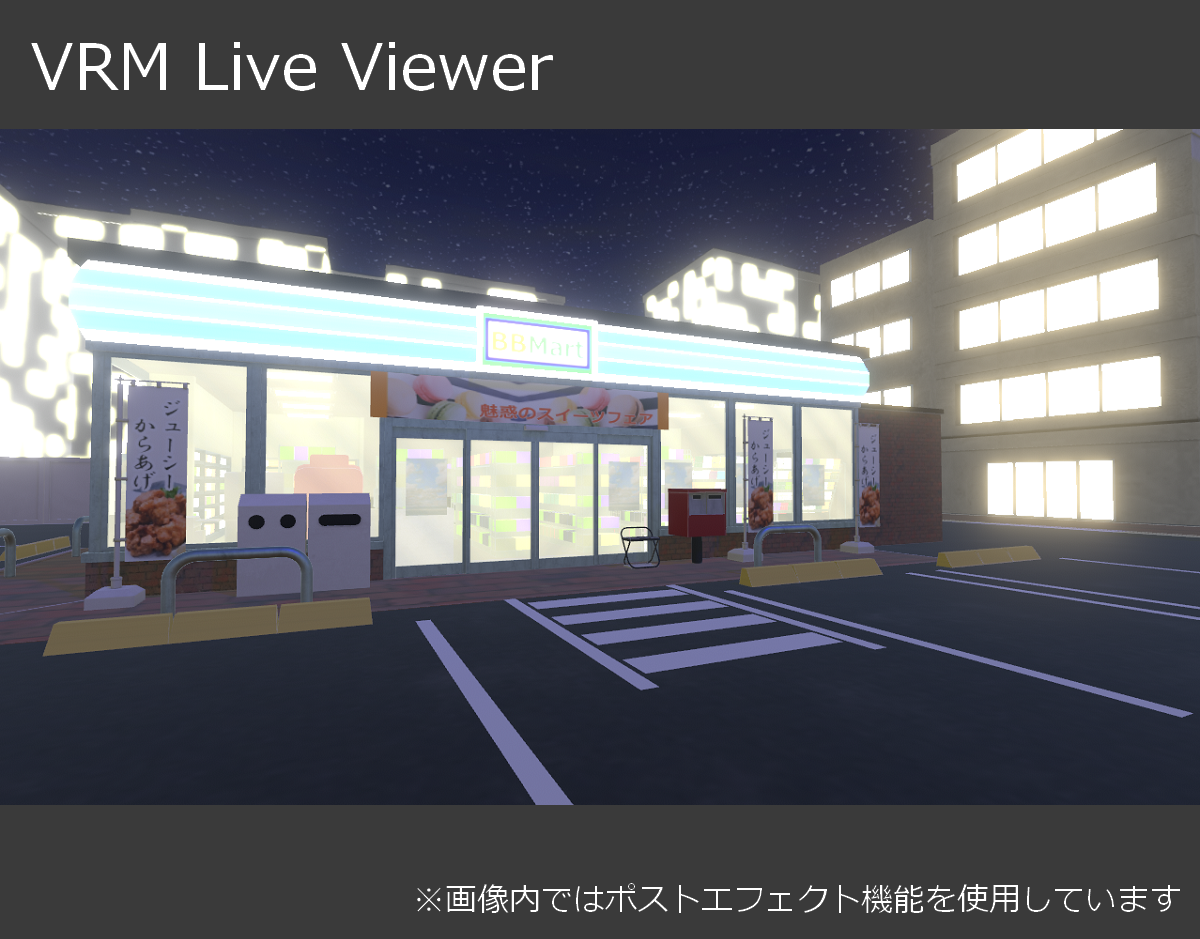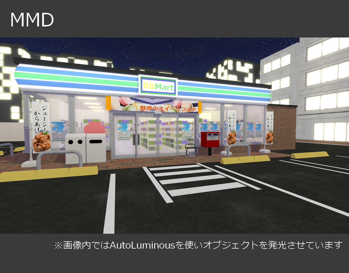 【3Dモデル】夜のコンビニ 2026/1/2 ステージ・環境モデル 新規の背景モデルを作ったのでBoothにて頒布します! 今回は夜のコンビニです。アセットを設置しただけで使えるようにしたかったのでコンビニだけでなく外周の背景物も制作してあります。 Conveniences Store by yuki on Sketchfab