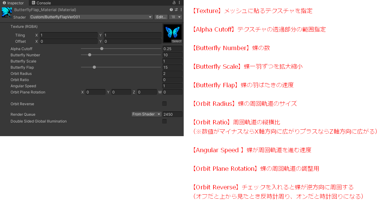 【シェーダー】羽ばたく蝶々のシェーダー 2026/1/16 シェーダー・エフェクト 新しくUnityシェーダーを作ったのでBoothにて配布します! 蝶の動きは頂点シェーダーで制御しているのでパーティクルシステムは未使用です。 なので(多分)挙動は軽いはず。